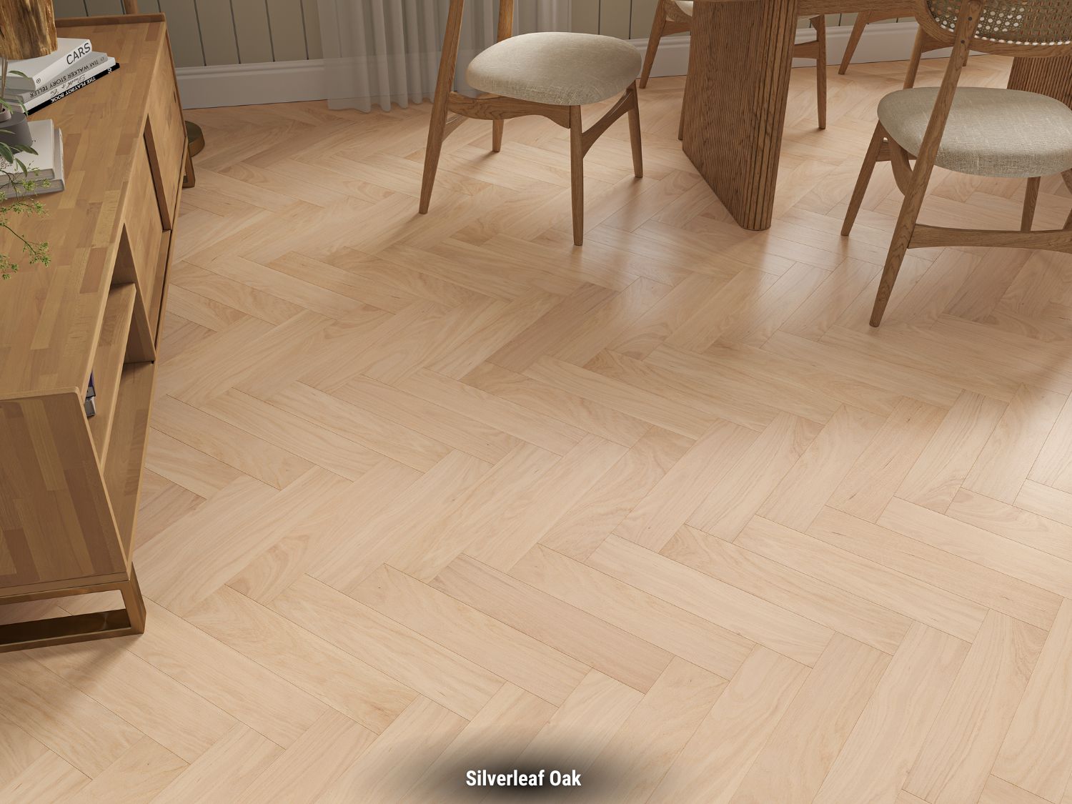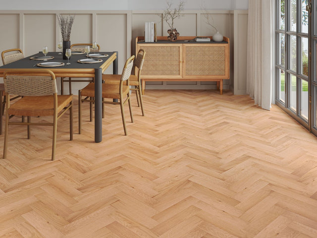 Elevate your space with the Woodland Oak Herringbone collection, a premium flooring range engineered for elegance and endurance. Each block features a 4mm European Oak surface over a high-density 11mm eucalyptus core for maximum structural stability. Finished with a brushed, UV-oiled texture, this FSC® certified range delivers a sophisticated 90mm x 400mm pattern.